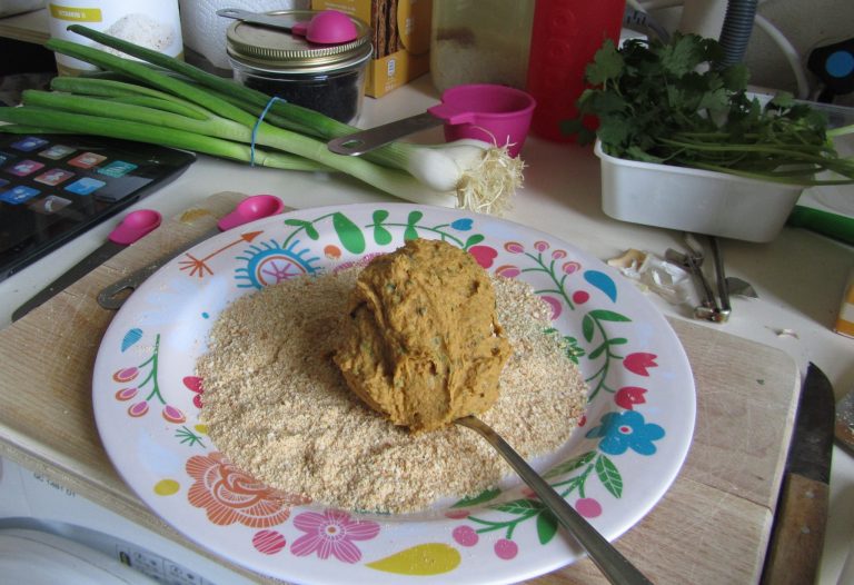 Ingredients: 250 g sweet potato / 1 can of cannelini beans or other white beans / 1 small onion, chopped finely / 1,5 tbsp tahini / 0,5 tsp apple vinegar / 1 small clove of garlic, pressed / pinch of cayenne pepper / 0,25 tsp paprika powder / 0,25 tsp black salt (optional: this gives a more smokey taste) / 0,5 tsp salt (or more if you don’t use black salt) / 0,25 tsp oregano / 0,25 tsp thyme / 1 tsp nigella seeds (optional) / 0,25 cup flour / 2 tbsp nutritional yeast (or extra flour) / hand full of fresh coriander (cilantro), chopped / vegan bread crums (the Dutch brand Joannesmolen is vegan), optional / coconut oil or olive oil for frying.