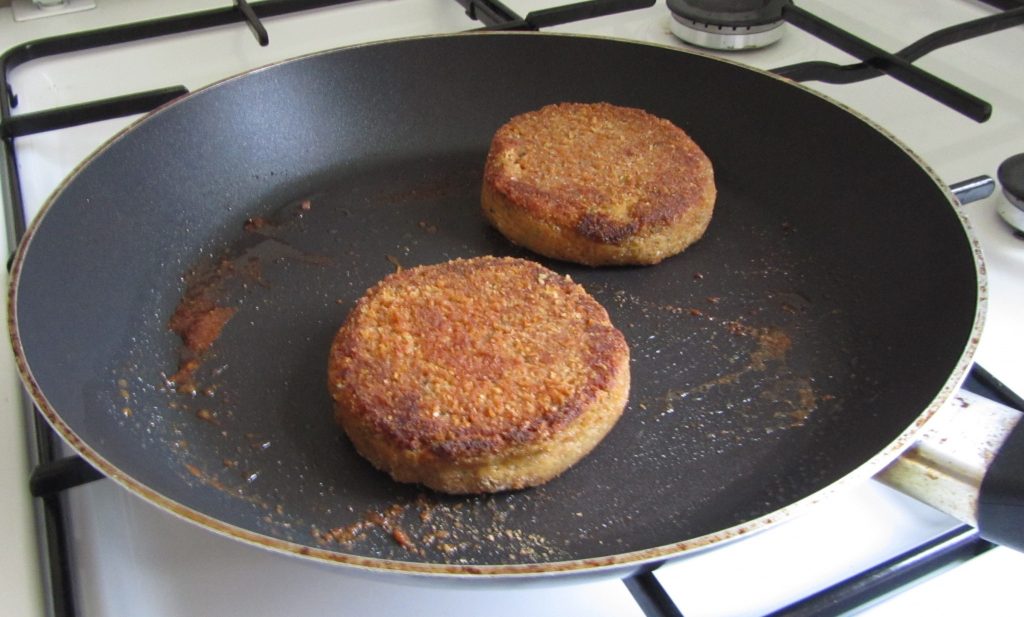 Mix all the ingredients, except the breadcrumbs in a bowl or food processor, until it reaches an even texture. If possible, put the mixture in the fridge for half an hour. This makes it easier to shape the burgers. See the instructions above (used with the Sweet Potato Burgers) for shaping, pre-baking, and baking the burgers. When you use an oven, pre-heat the oven whilst the mixture cools down in the fridge.