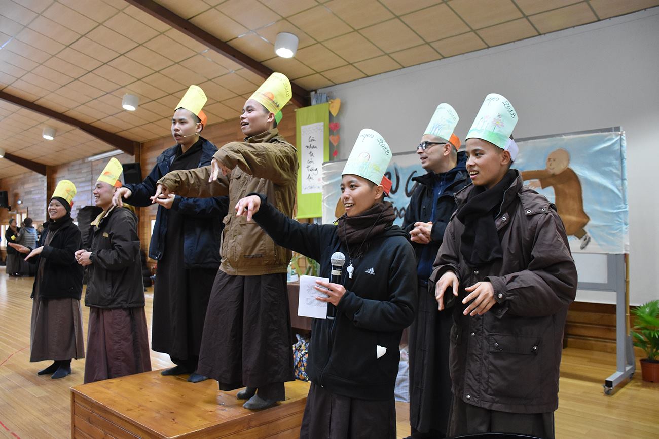 At first, I thought play as one of the four elements (study, practice, work, and play) in the Plum Village tradition for only young monks and nuns. Even though I’m still young, I was very serious and determined to heal my wounds with the practice and study, and forgot how to play. During the monastic retreat, I had a chance to watch the performances of my brothers and sisters. Many of my elder brothers and sisters danced. I still remember Sr. Chan Duc (Sr. Annabel) and Sr. Dieu Nghiem (Sr. Jina) dancing. On another occasion, I saw Br. Phap Ung dancing when he gave a Dharma talk. I deeply admired their practice, but then I admired their playfulness. It helped me to change my perception that play is actually for everyone. My mentor Br. Phap Luu invited me to dance ballet for the Lunar New Year’s Eve Performance last year. I danced ballet with him and some of the Son Ha brothers.