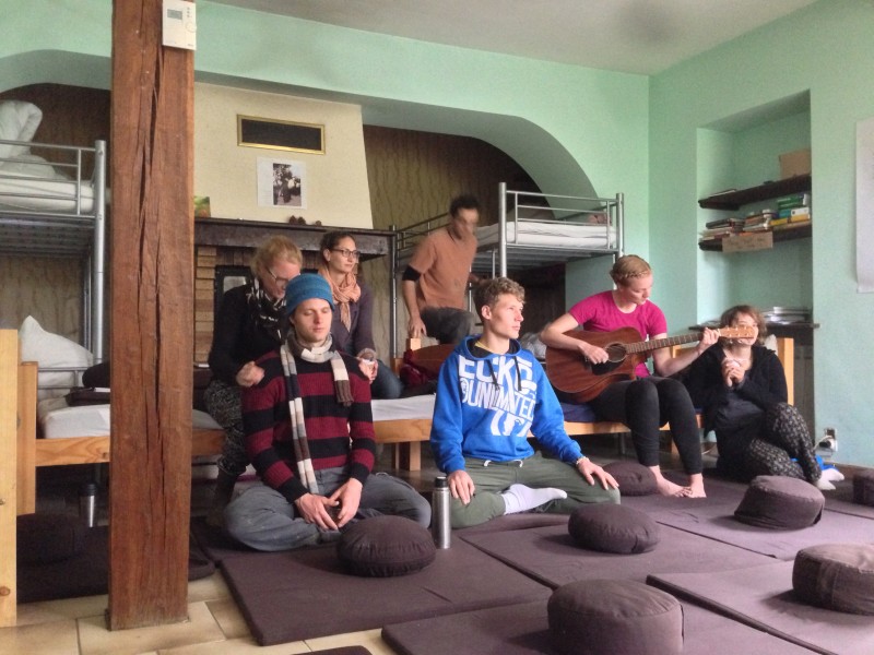 Después de la meditación, los hermanos y hermanas de Plum Village ofrecieron el canto Namo Avalokiteshvaraya. Aún me conmueve recordar la imagen de tanta gente llorando (incluyéndome a mí) al escuchar este hermoso canto y recibiendo la energía llena de compasión. En verdad se sintió como si el tiempo y el ritmo acelerado de la ciudad de Barcelona se detuviera por completo durante ese instante, y sólo se difundiera una hermosa energía compasiva y solidaria entre los asistentes.