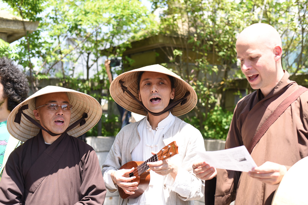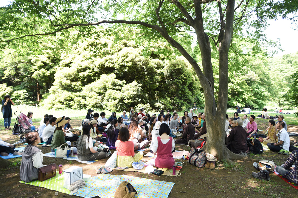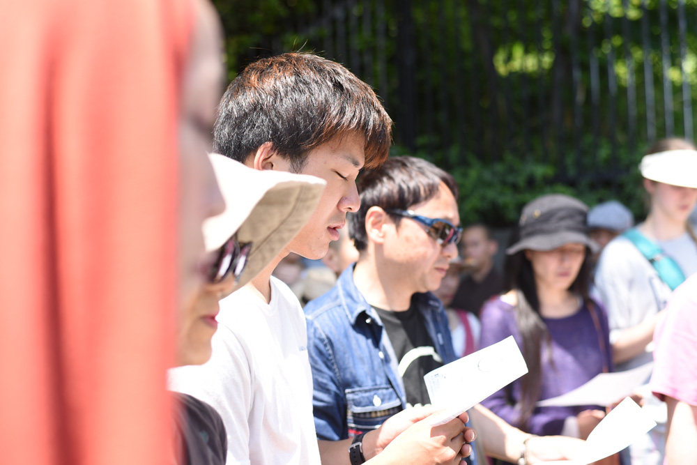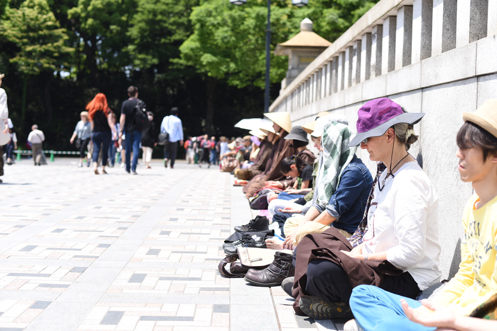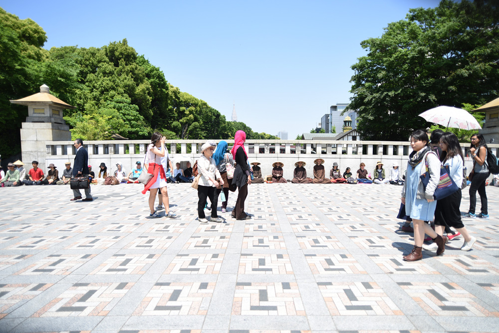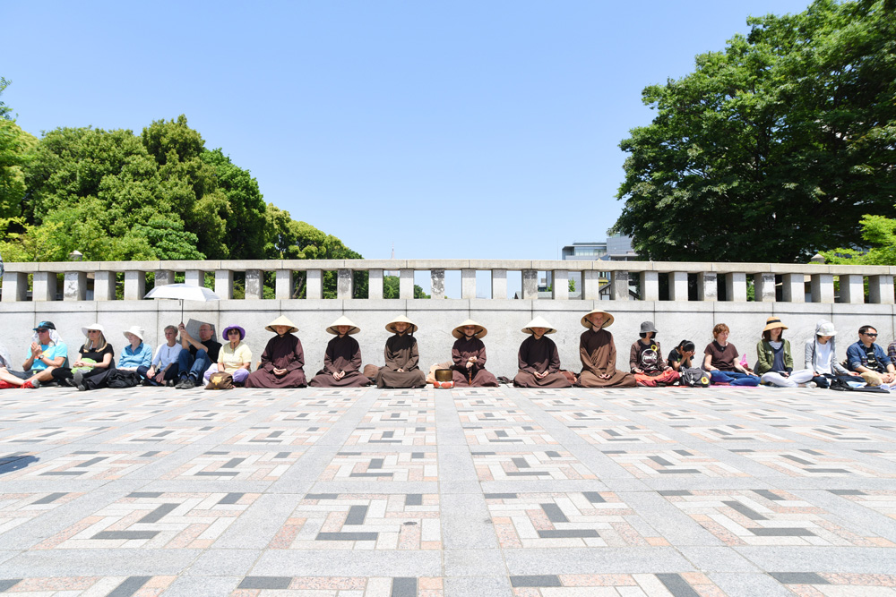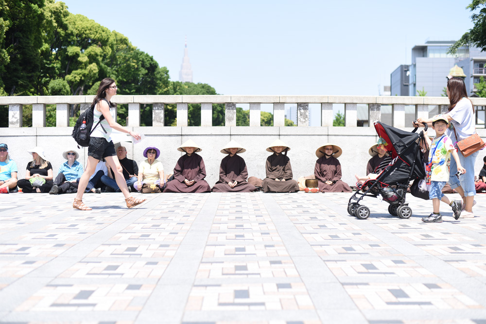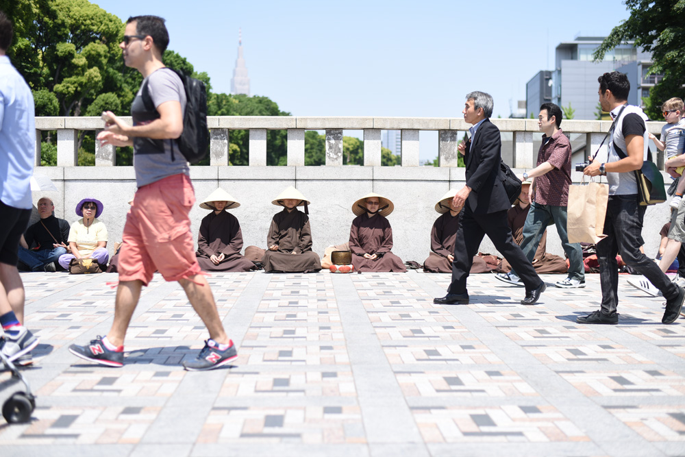 On Saturday, 9 May 2015, monastics from different Plum Village practice centres and about 100 young people participated in a meditation flash mob on Harajuku Bridge, bringing a unexpected energy of stillness and concentration to the bustling heart of the city.