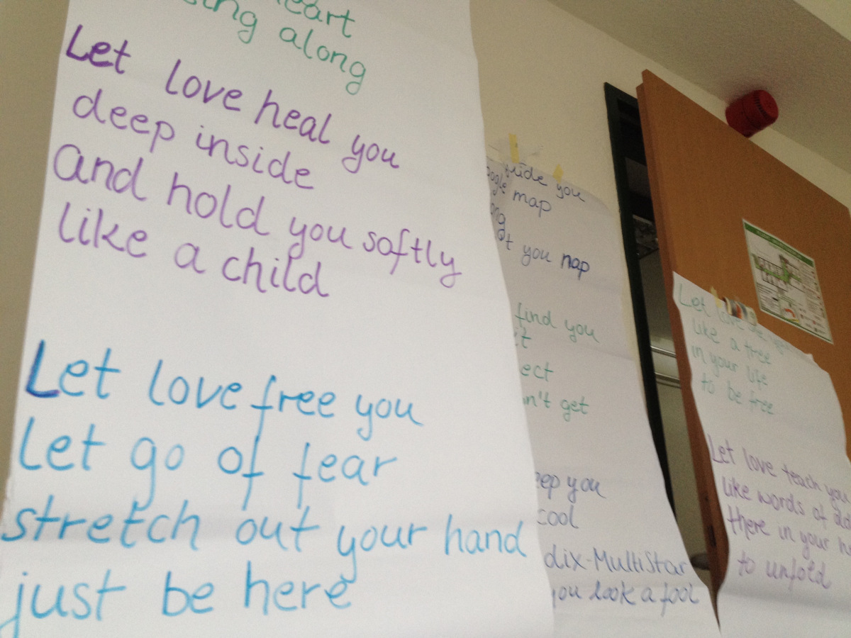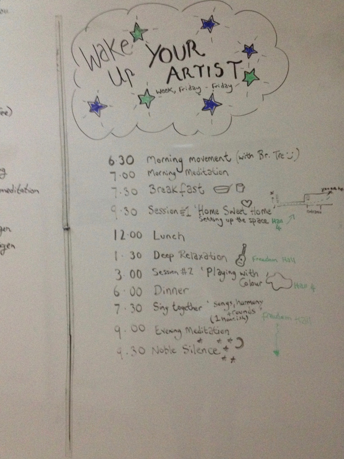 Last winter, Larissa had introduced to me the idea of a week of play and ways of making art – songwriting, movement, painting and poetry. There’s that moment you say yes and then the rest just came from there… we were in touch in the months before and I could feel Larissa’s passion for making a space that was safe, creative and good fun. Arriving at the EIAB a day before our Wake Up Your Artist retreat, we sat on the grass in the sunshine and put together our ideas. A few hours later, we had this map and the names of some of the sessions we would facilitate – ‘Playing with Colour’, ‘Playing with Words’, ‘Art as Activism’, ‘Relaxations’, ‘Day In The Woods’… the rest rolled out from there… with a cup of tea each night after the evening meditation just to check in… 🙂